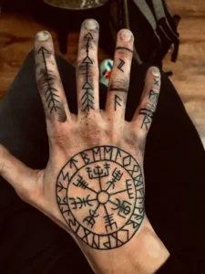 4. Runen: Runen zijn populaire symbolen voor Viking tattoo hand ontwerpen. Elke rune heeft een betekenis, vaak met betrekking tot bescherming, kracht of wijsheid. Deze symbolen kunnen klein en subtiel zijn, maar bevatten veel betekenis.
