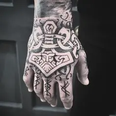 1. Mjölnir (Thor’s Hamer): Dit symbool wordt vaak gekozen voor Viking tattoo hand ontwerpen omdat het kracht en bescherming symboliseert. Thor’s hamer werd gedragen door Vikingen om bescherming af te wenden en strijd te voeren.